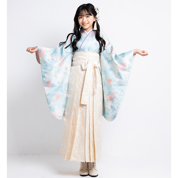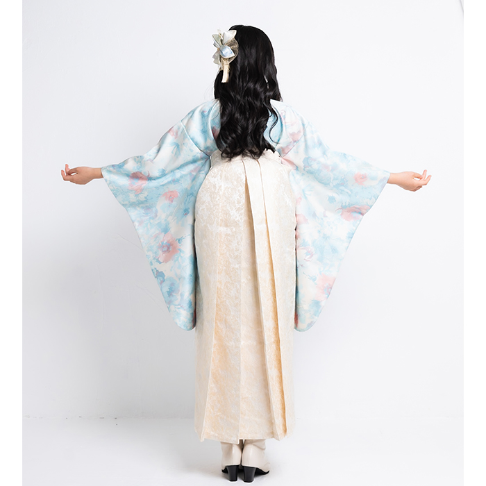ふんわりとした淡いブルーに花々が優しく描かれた着物と、繊細な模様のクリーム色袴。