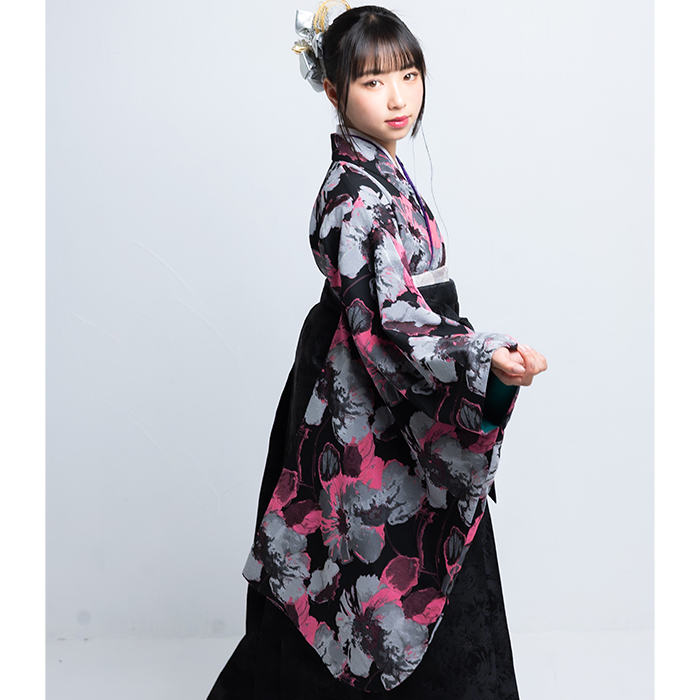 咲き誇る花のように華やかな着物に、重厚感あるブラックの袴を合わせた一着。